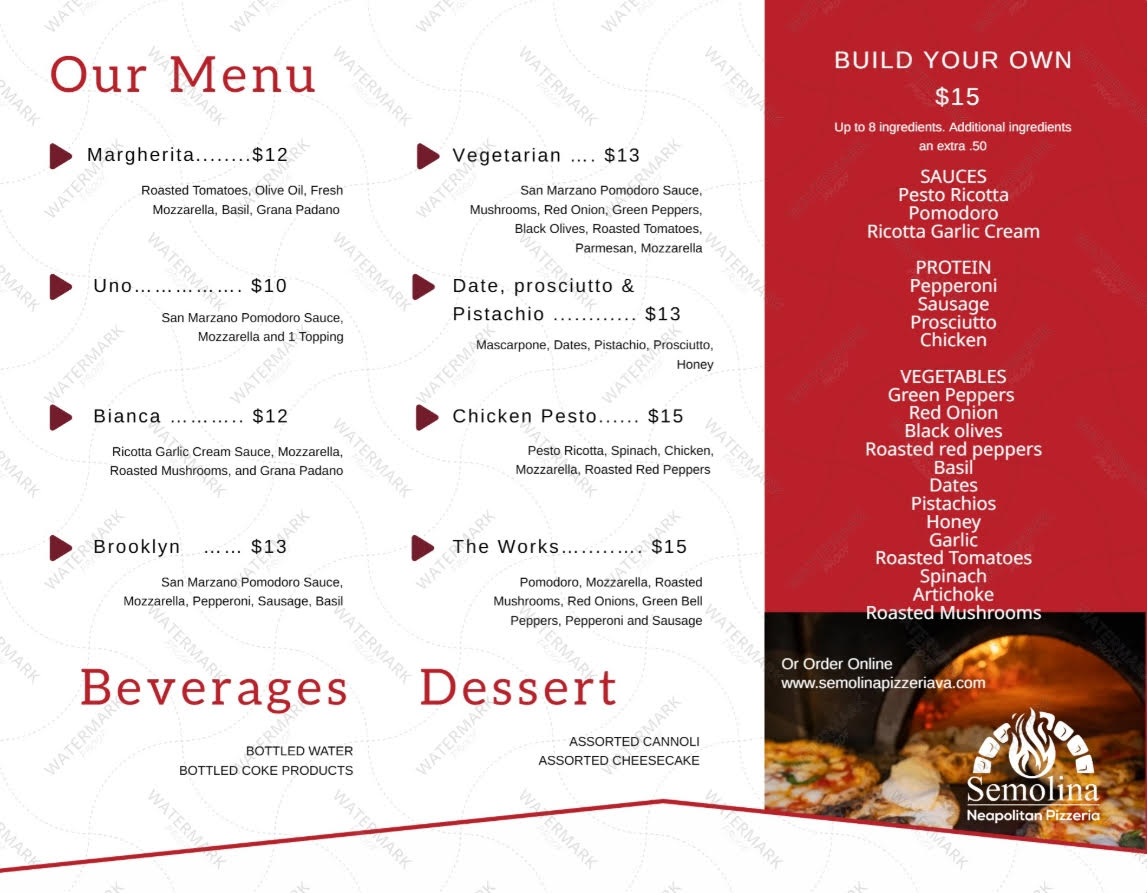 The Semolina Neapolitan Pizzeria Menu offers a mouthwatering variety of traditional Neapolitan pizzas, crafted with the freshest ingredients and a passion for authentic Italian flavors. Nestled in the heart of Abingdon, VA, at 238 W Main St, this cozy pizzeria brings the best of Italy right to your table. From classic Margherita to creative specialty pies, each pizza is hand-tossed and baked to perfection in a wood-fired oven, ensuring a crispy, flavorful crust with every bite.